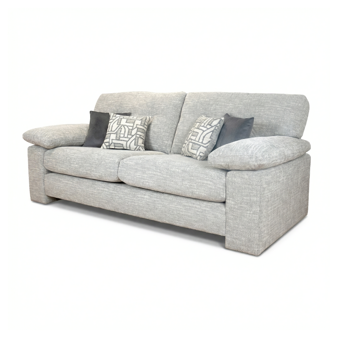 Upholstered in soft chenille fabric, the Morgan is finished with a combination of luxurious velvet and modern geometric scatter cushions. These add texture and visual interest while keeping the overall look calm and considered. Its three-seater size offers generous space without overpowering the room, making it suitable for both family use and relaxed hosting.