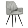 The gently curved back and padded arms offer comfortable support for longer meals, while the stitched detailing adds subtle structure and interest. The faux leather finish is smooth and wipe-clean, making it a sensible choice for busy dining spaces where spills and marks are part of everyday life.